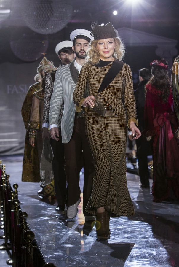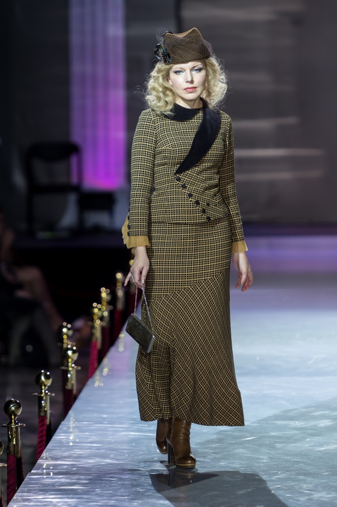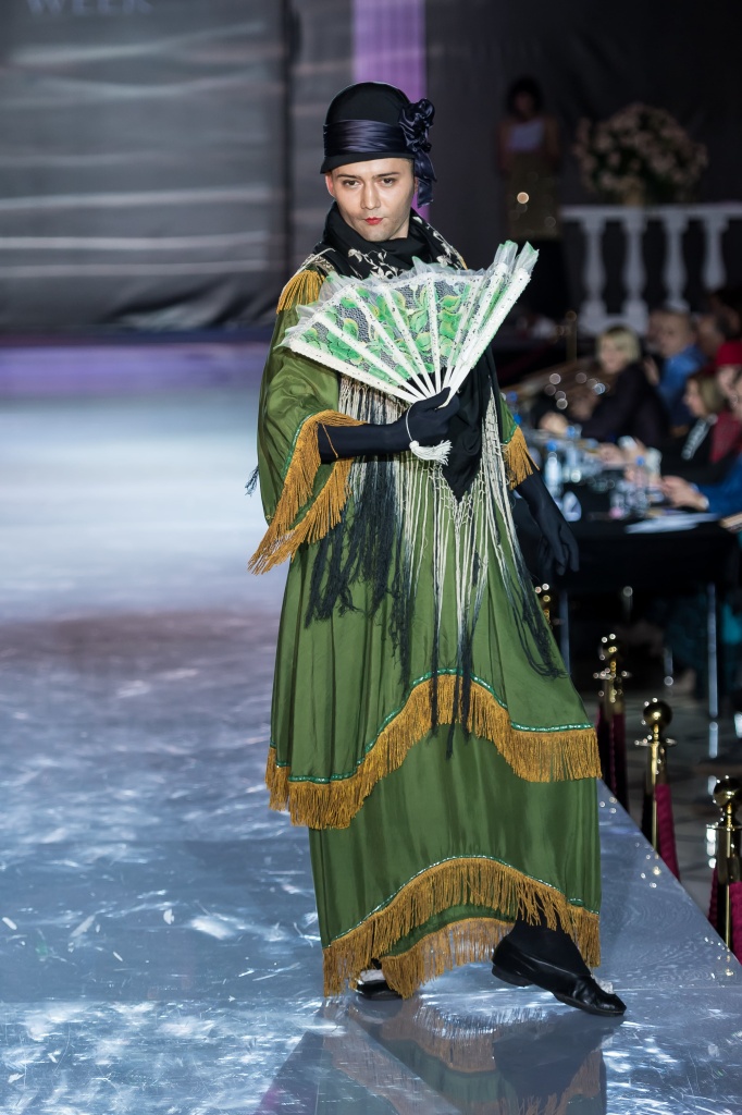Платье Калягина, было обшито бахромой от обычных занавесок, Вы сейчас именно его видите на подиуме! На платье осталась дырочка от сигары, которую в кадре курил Калягин, как память. Шаль тоже та самая из фильма!
